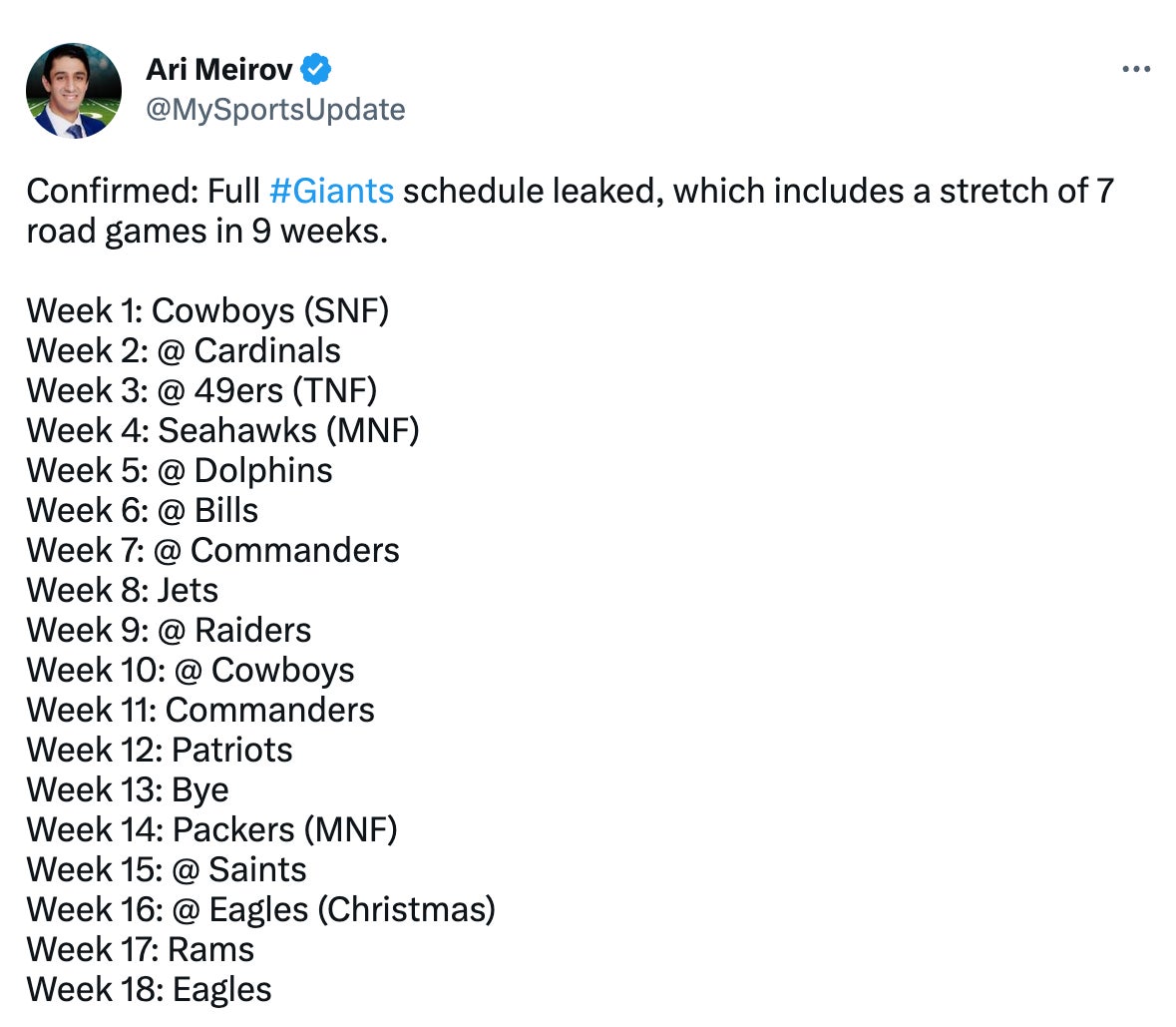 The Giants Leaked Schedule Has Them Playing 7 Of Their First 10 Games On The Road, Which Is Obviously A First In NFL History