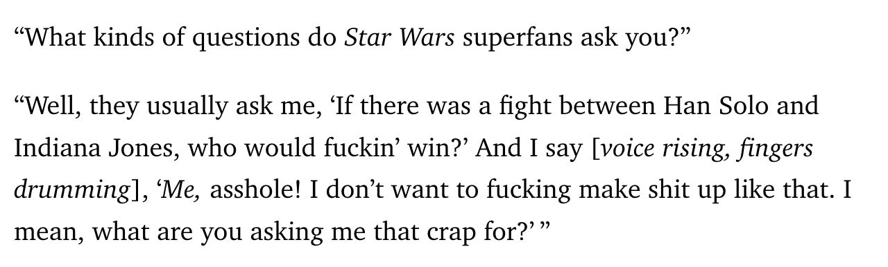 So this attitude isn't new by any stretch of the imagination, and honestly - Star Wars fans only love him more after he says all of this shit.