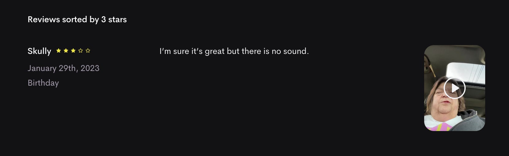 My favorite part of her profile is one only 3-Star rating where she recorded a Cameo that had zero sound. Hilariously on brand.