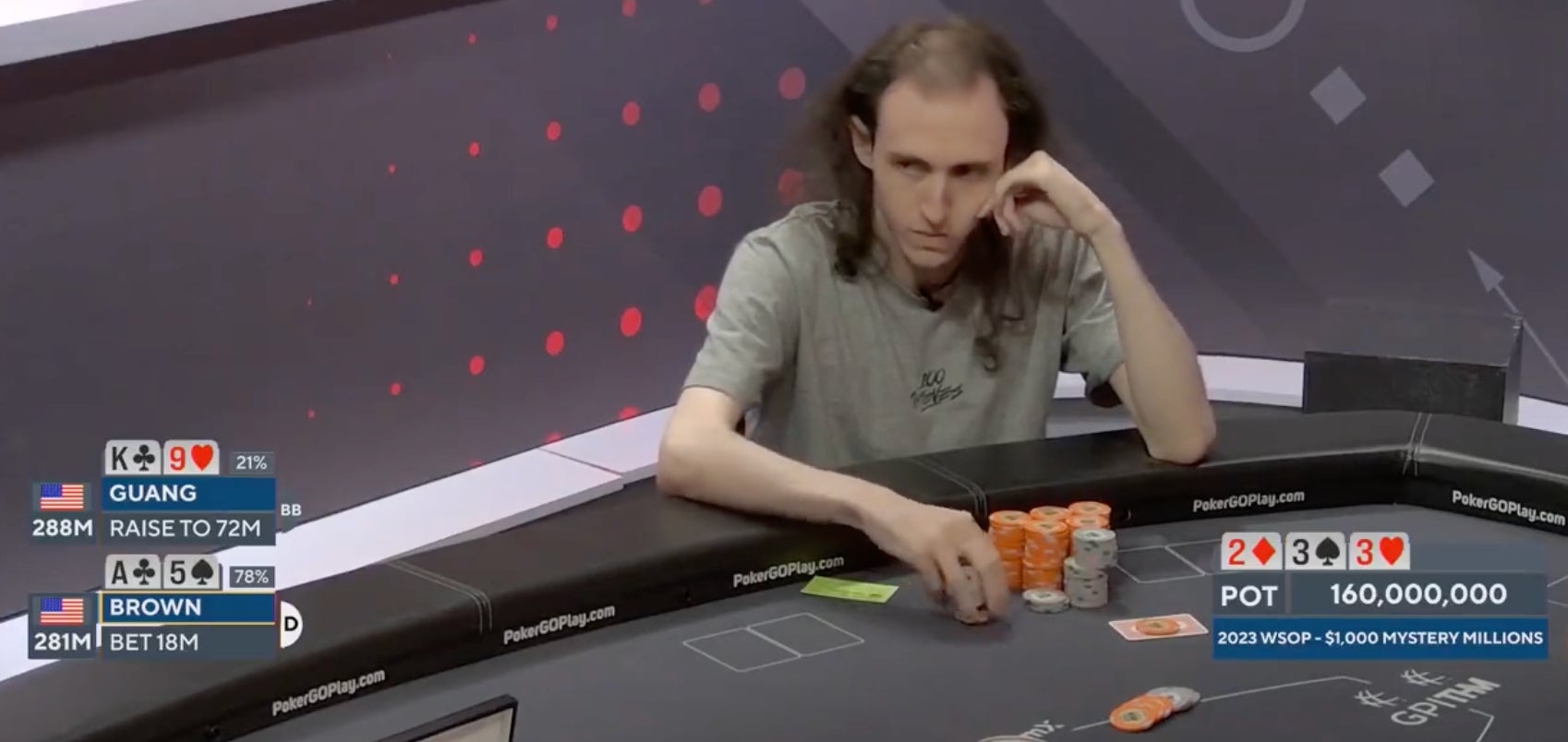 On the 233 flop, Guang check/raised Brown's cbet to 72 million with king high, which Brown called with ace high and a gutter.