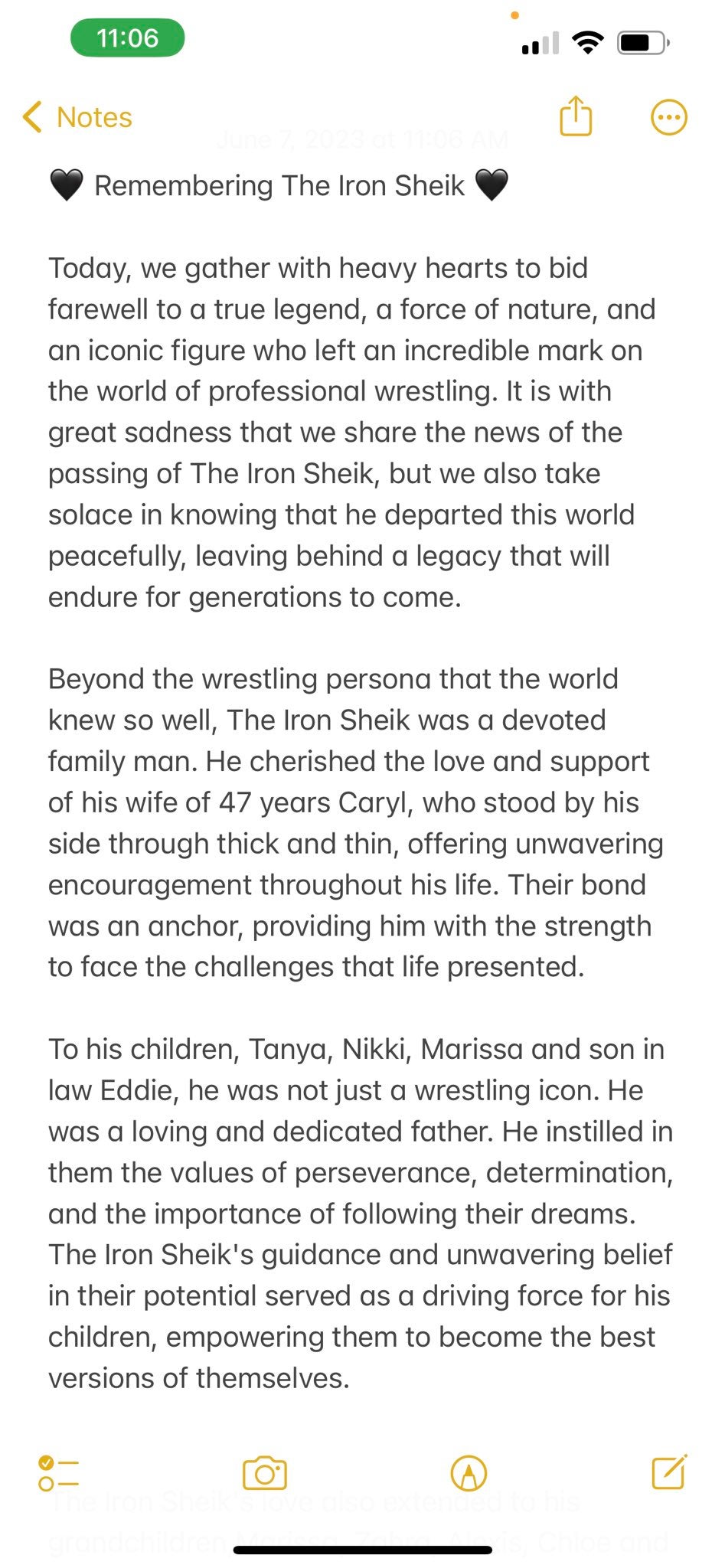 The Iron Sheik, whose real name was Hossein Khosrow Ali Vaziri, is survived by his wife Caryl and four children. Rest in peace, bubba. You will truly be missed.