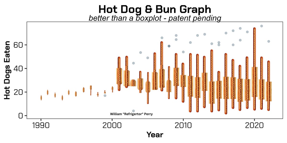 Notice how the cute little pigs-in-a-blanket of the 90s engorge into the jumbo dogs you get at the ball park or county fair today as more contestants began competing in the early 2000's. And while the quality of the average contestant has greatly improved over time, the major outliers are the real story here. To address the Bear in the room - I have no idea what happened with Chicago Bear's legend William "Refrigerator" Perry in 2003 (4 lousy dogs). This dude could practically beer bong an entire case back in the day. Maybe they didn't allow him to dip his dog in beer and he quit. I don't know but even Big Cat's 12-spot in 2016 was good enough to avoid a gray outlier fat drip.