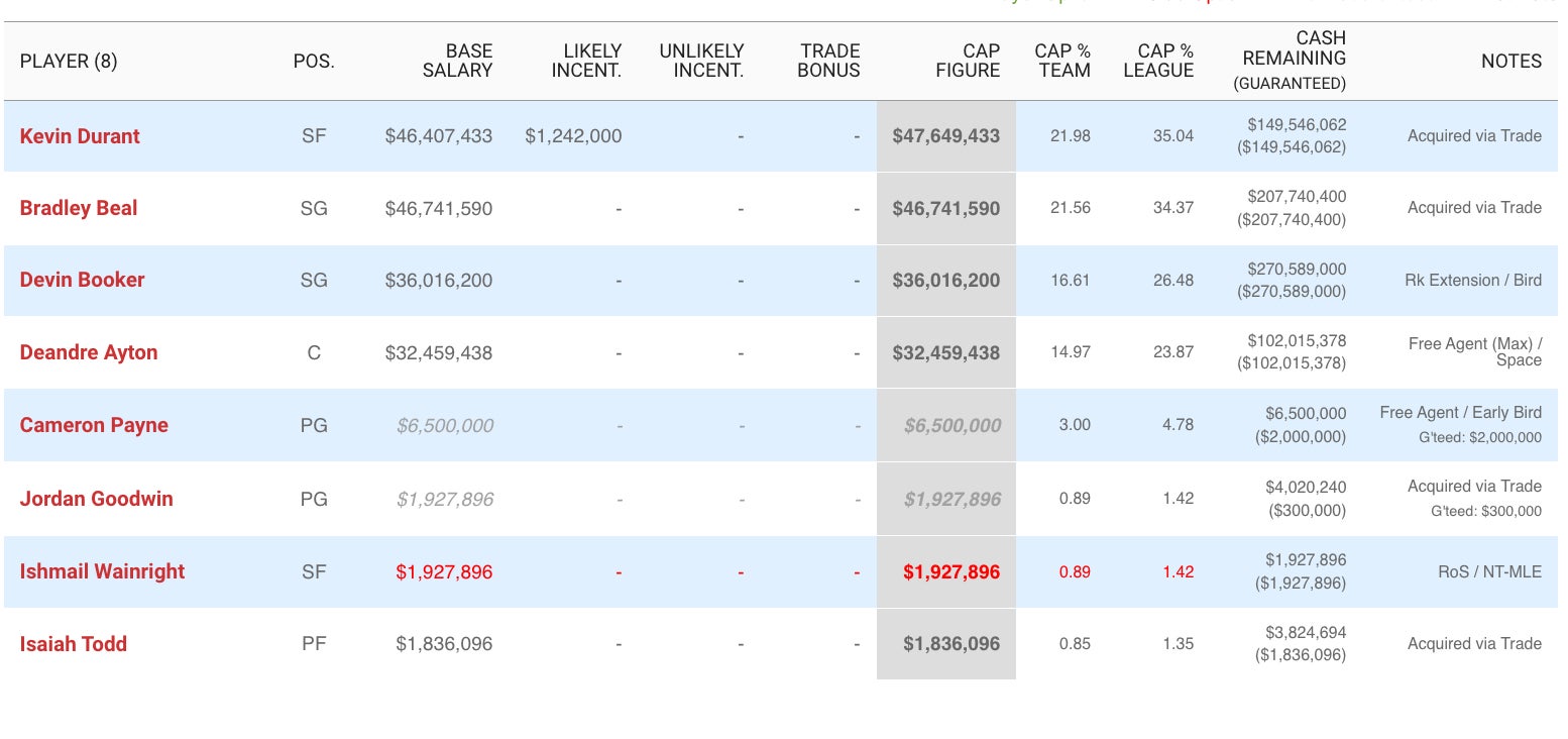 When you look at just their guaranteed money/option guys, the active cap hit is $175M. The Suns also have $41M in cap holds for a total of $216M. The apron number is $182.5M. The Suns still have 7-8 spots to fill on this roster, and if they can't use Ayton's money that leaves them with what, veteran minimums and the tax payer MLE? Coming off a postseason run where it was very clear that the lack of depth was a glaring issue, the Suns have basically doubled down on just saying to hell with depth if the starters just score a ton.