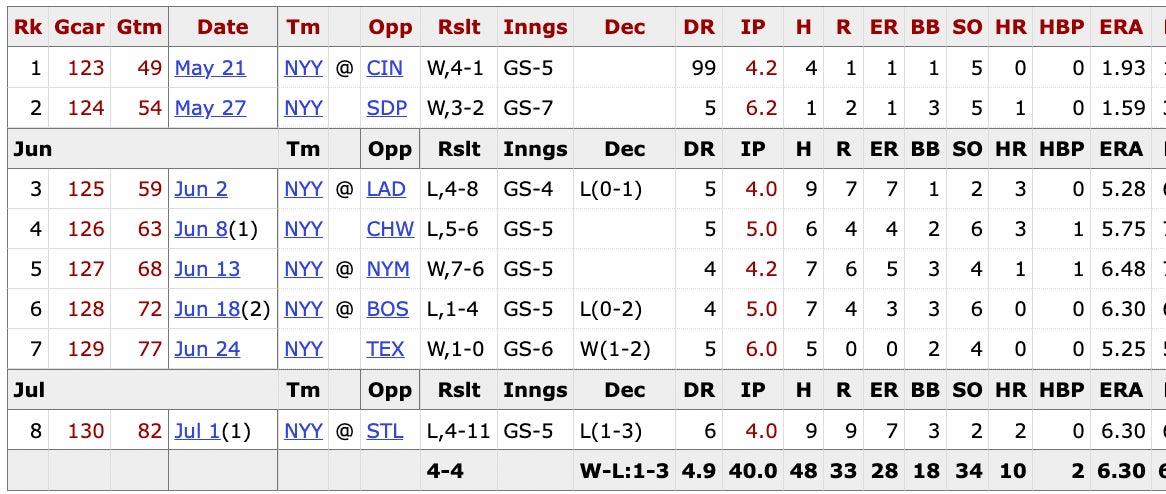 The Orioles had their way with Severino tonight, tagging him for 10 hits in less than three innings of work. Here's how his season has shaken out prior to tonight. Spoiler alert it's a lot of bad.