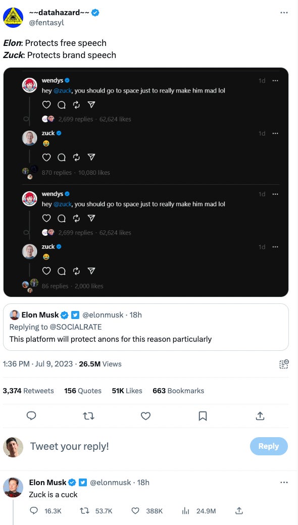 Regardless, things have been heating up between Mark and Musk ever since they agreed to a cage fight a few weeks back. Since then, Meta has released its own version of Twitter (Threads) which resulted in Elon filing a lawsuit. Clem wrote about it here…