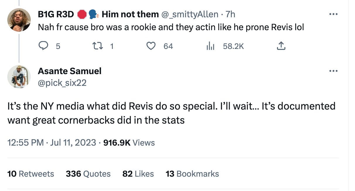 But let's rewind just a bit. Before this even reached Revis' desk. It all started with ESPN's Jeremy Fowler releasing his anonymous GM/Scout survey of the top players at the Cornerback position today. Jets CB Sauce Gardner, who had just finished his rookie season, was #2 on the list and former Patriot, Asante Samuel took an unprovoked shot at the former Bearcat.