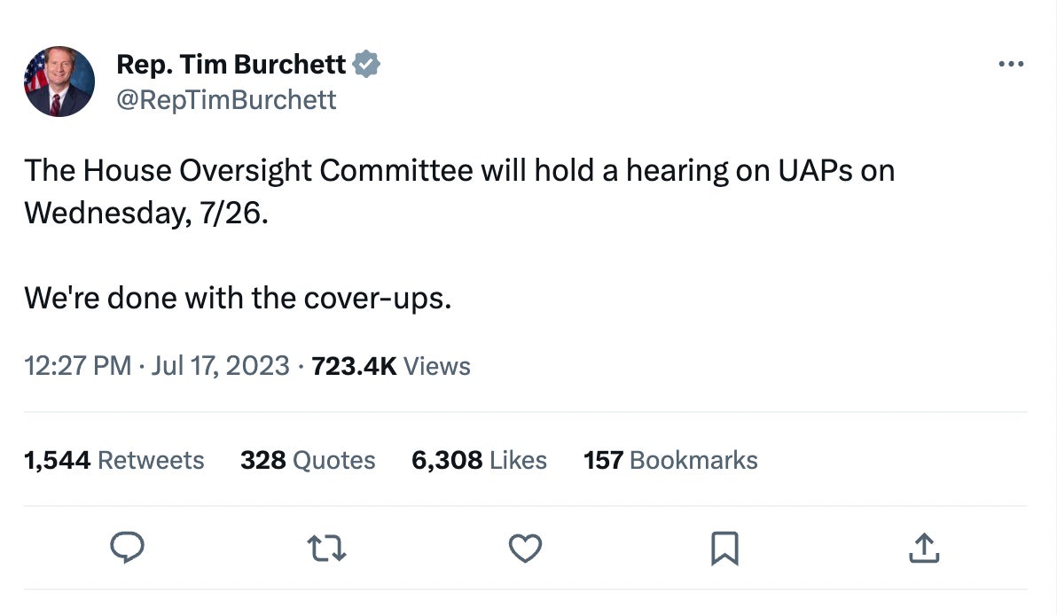 Also, I hate the people who are saying this is a psy-op or a distraction from what is really going on. Ukraine, student debt, covid-19 cover-ups, Hunter doing coke on camera and then leaving it in the white house…I don't give a shit. There's no more eternal or bigger question than aliens. Than are we alone. Those other things might be the psy-op to distract us from aliens. If Tim Burchett doesn't bring a little green guy with him to the hearing I will hate him forever. My calendar is set for 7/26. See everyone on Wednesday. And by "everyone" I mean the aliens too.