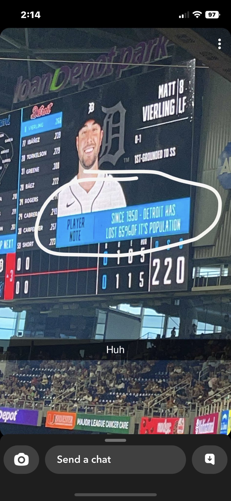 I also need to mention it from a graphic standpoint; nothing about this makes any sense. I like Matt Vierling, but he's been playing in Detroit for less than one entire season. I believe that he's not responsible for Detroit's loss in population since 1950. As someone who proofreads his blogs three times yet still constantly makes spelling and graphical errors, I should probably be the last one to point out that the powers that be at LoanDepot Park didn't even use the right form of "its." Detroit's lost 65% of it is population since 1950. Did DeSantis pass a bill not to teach grammar in Florida, either?