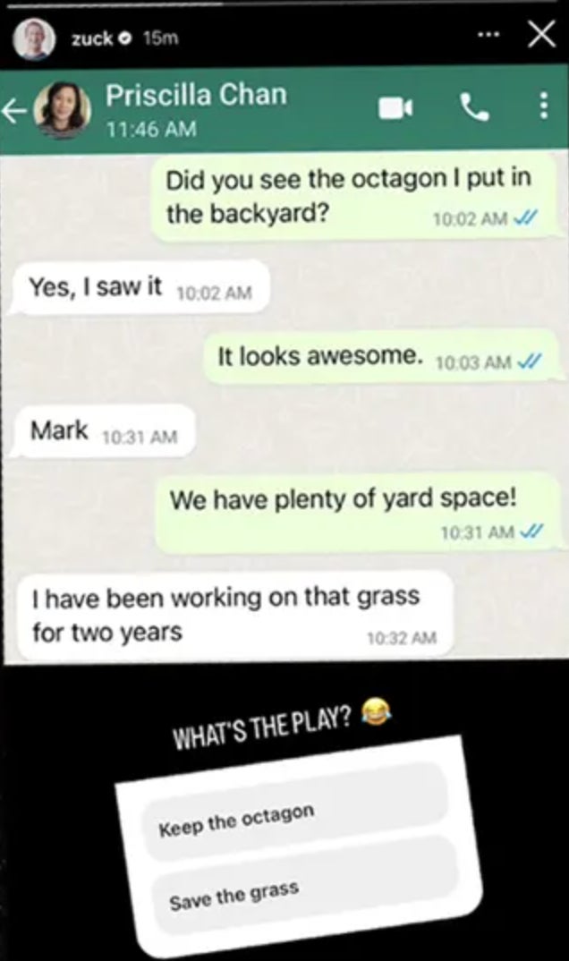 Seems Zuck knows he now needs to at least consider getting rid of his new training toy … because he posted a poll asking his followers whether he should "Keep the octagon" or "Save the grass."