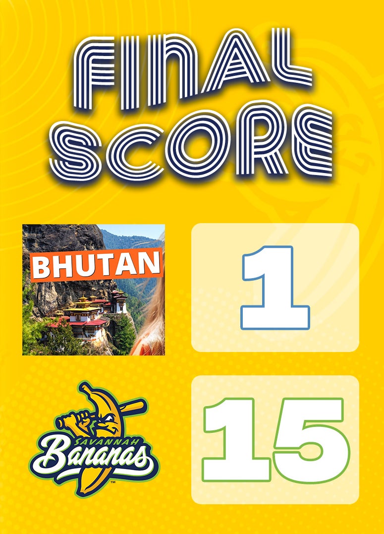That's right Bhutan will fall to the Savannah Bananas 15-1. All those months of practice and discipline and overcoming adversity will be washed away in a sea of yellow jerseys standing on each other's shoulders while pitching and doing summersaults while rounding the base paths on gappers.