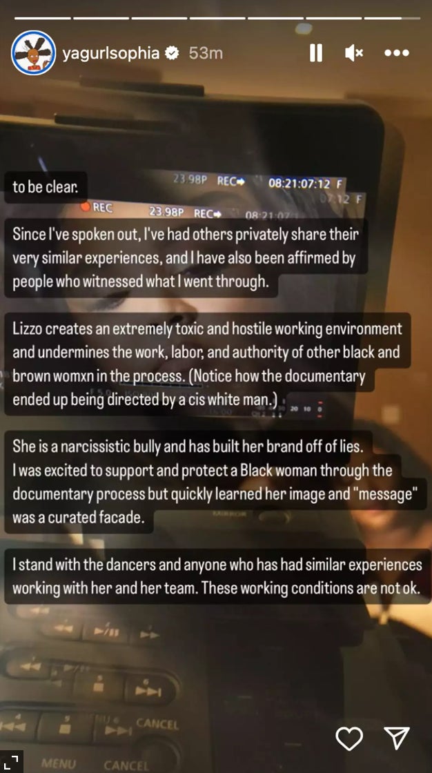 "Lizzo creates an extremely toxic and hostile working environment and undermines the work, labor and authority of other Black and brown womxn in the process," Allison claimed in a followup post on Wednesday. "Notice how the documentary ended up being directed by a cis white man."