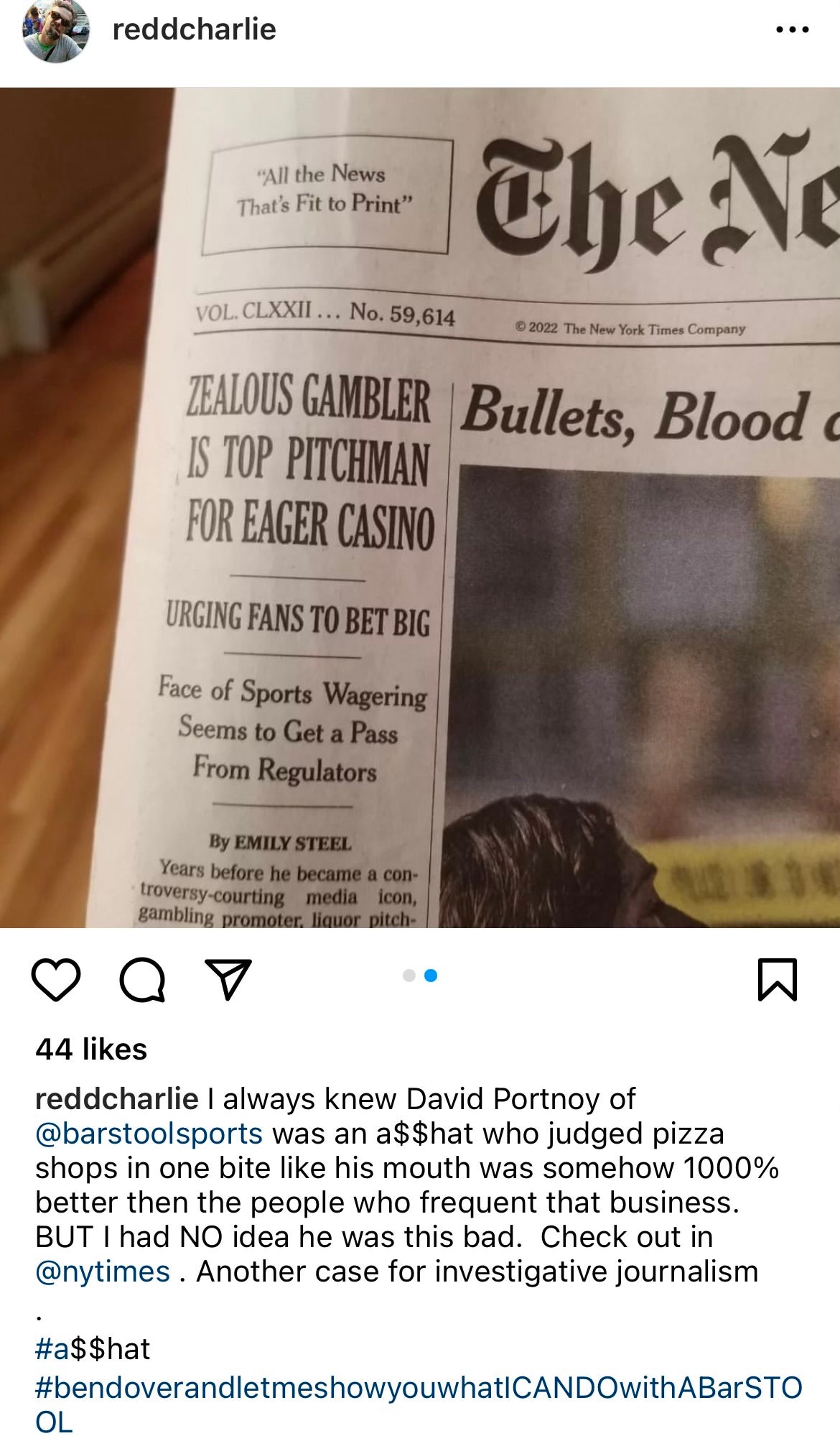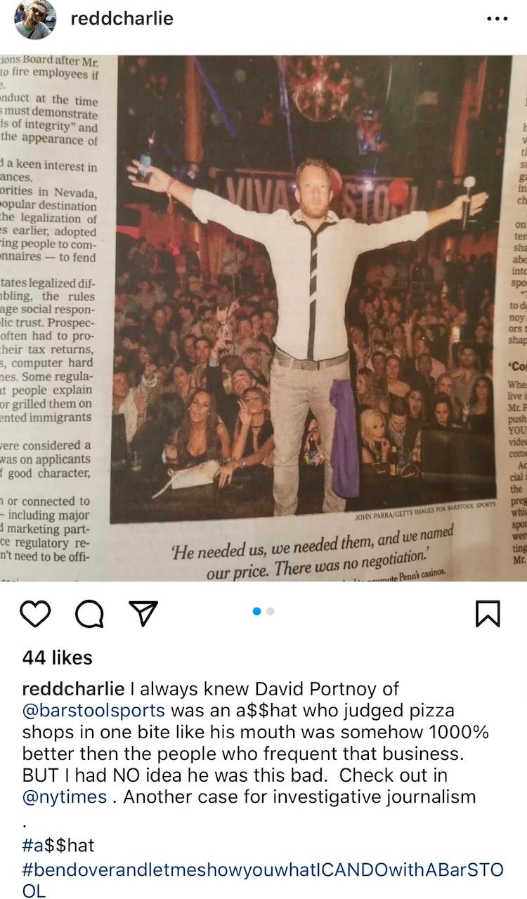 "Redd was vaguely familiar with One Bite, the hugely popular pizza review series created by controversial Barstool Sports CEO Dave Portnoy. "He had heard rumors of other mom-and-pop businesses going under due to poor reviews from Portnoy, and he took issue with the central conceit of the series, as well as the bombastic, fratty persona Portnoy had built for himself.“ Redd said they “made something that is not political at all, very political.”I don’t know why he would take a disagreement about pizza and move it into the political realm. I don’t see the element of that. Redd claims, “Dave Portnoy is driving people away from my industry. I did something to stand up to something I disagree with. And that’s the American way.”