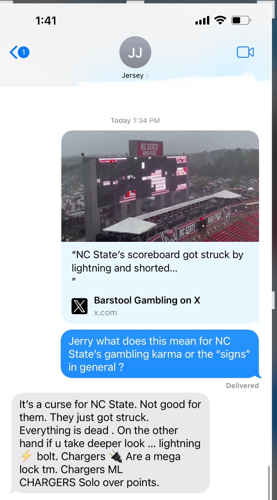 Speaking of wacky shit. Nothing is wackier than your scoreboard getting struck by lightning. NC State hosting Notre Dame is one of their biggest games of the year. To have rain and stuff at all is a bummer to tailgates etc, now add in the fact that they are watching other games go to a halftime break and they still haven't started. Absolutely sucks. I feel bad for my trivia partner, and fellow champion (more than the Experts can ever say) Quigs. He's an NC State superfan, just let the man watch the game. He doesn't deserve a freak accident like this. Bullshit.