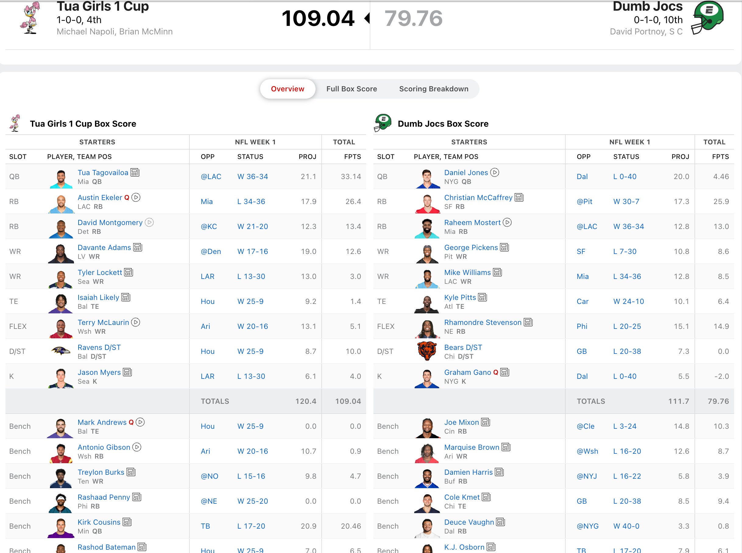 Napoli was wise to wait on QB but went QB/QB in back-to-back rounds with Kirk Cousins and Tua. Meanwhile, Cole Kmet had a respectable game with 9.4 points, but Daniel Jones went 15.54 points below his projection and Dave's team is in an early tailspin.