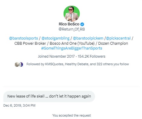 I don't want to accuse Rico of anything. I was a Bosco long before I started working at Barstool. Been Rydng ever since that fateful day in 2019 when I repented for my sins and was able to convince him to unblock me by sending a series of apology DM's from a burner account.