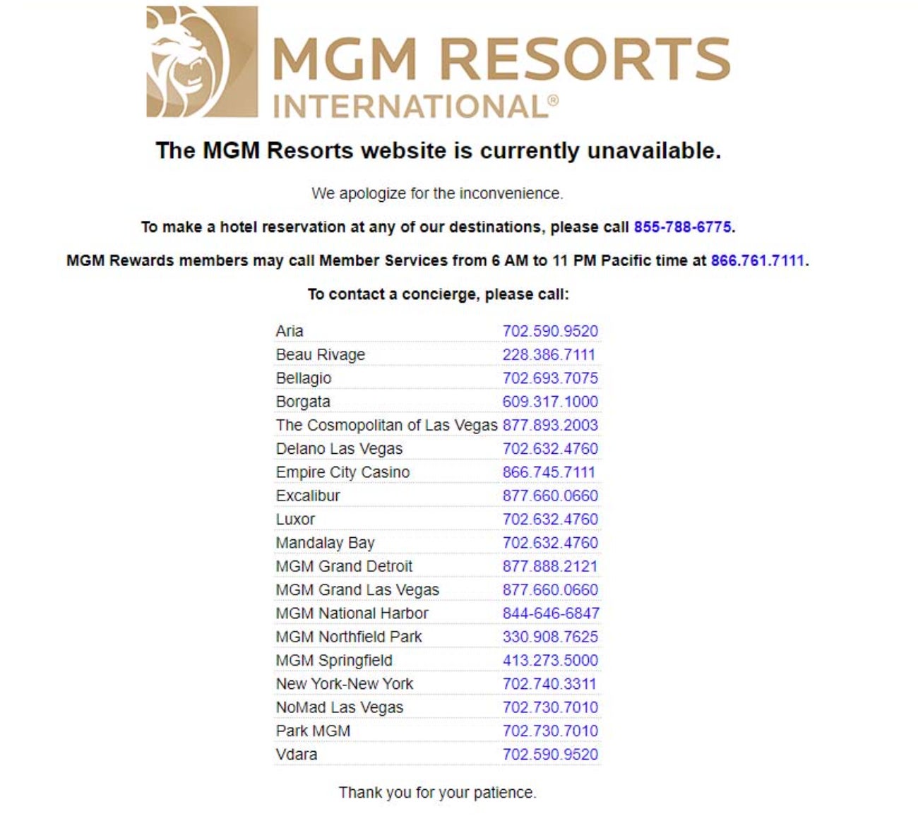 The outage appears to be affecting MGM properties outside of Vegas, including the Borgata in Atlantic City, New Jersey, and the Mississippi-based Biloxi.