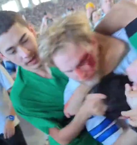 Mid headlock we have the big reveal that Cowboys fan is bleeding profusely from his eye. I feel like you don't see many stadiums fights escalate to MMA levels of blood. Jets fans really should have let him go at this point. If for no other reason than "Bitch I'm a Jet" guy's face is clear as day as he's assaulting this man. He's going to have a problem denying anything in court.