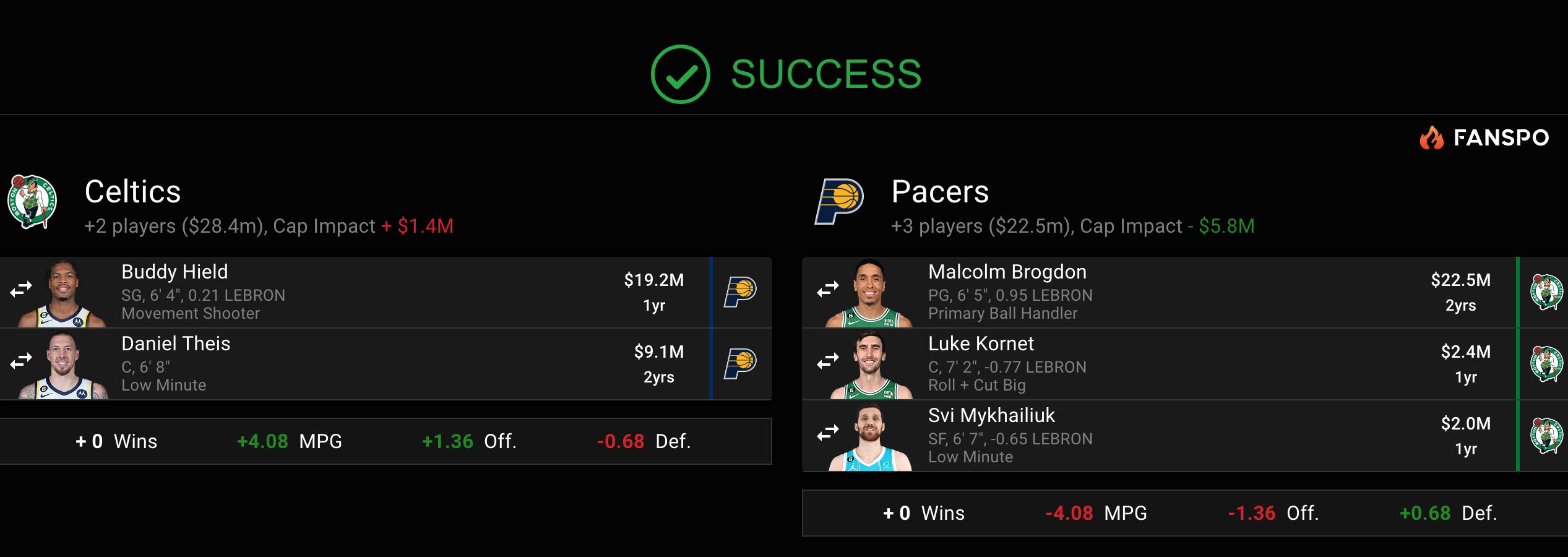 Call me crazy, but this might work for everyone involved. Celts definitely get a little thin at PG, but you can figure that out. They avoid any sort of Brogdon drama while also bringing in just as good of a shooter, it doesn't bring on any crazy money long term as they get closer to Tatum's supermax, and you get to bring back Theis who looked AWESOME at the FIBA World Cup.