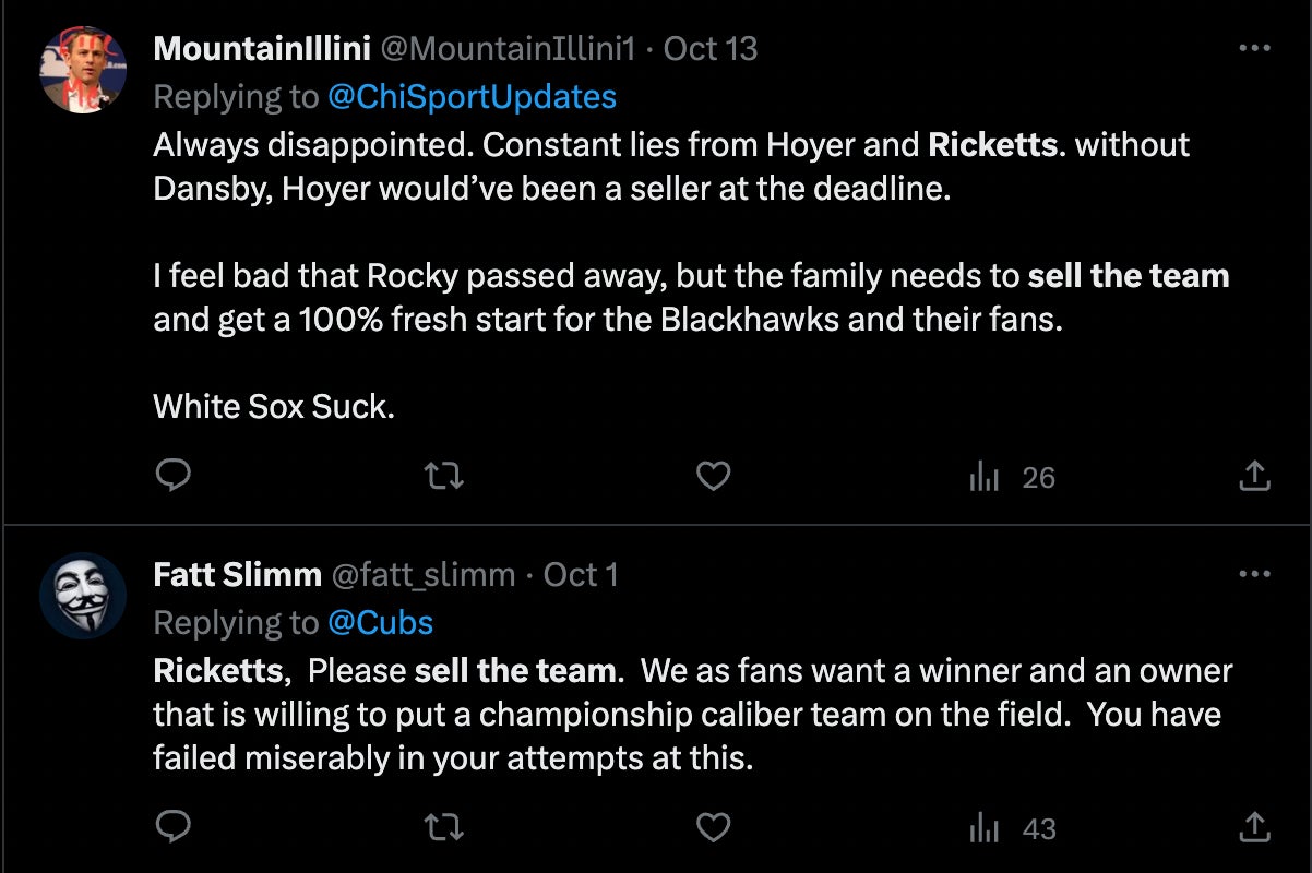 Before we get to that, I'm going to shift my focus to the team on the North side of town, the Chicago Cubs. I've noticed a lot of Cubs fans shit talking the Ricketts for the current state of the Cubs, and it makes me want to jump off the Sears Tower. Here are a few examples from a 2 second search on Twitter: