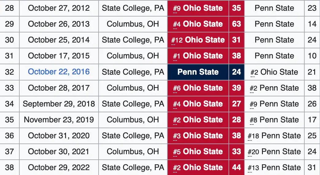 But the fact of the matter is that I am not nervous at all. Ohio State has the better offense, the better defense, the better coach, and we’re at home. I simply do not see a way in which Penn State comes into this stadium and wins this game today. And the reason I can’t see it happening is because I’ve literally never seen it happen. Are we on the same page that Ohio State has won 10 of the last 11 against these clowns?