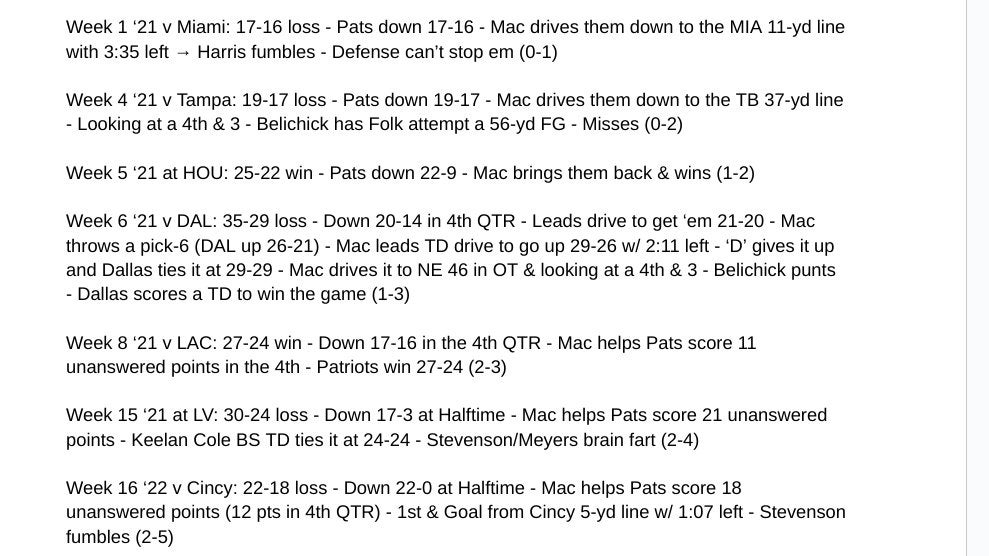 That next to last one (there's a typo, and it was actually 2022) was of course the one that ended on the worst play in NFL history, which prevented a tie game with 0:00 left to go to overtime. But the first and last ones are especially galling. Red zone mistakes by Damien Harris and Rhamondre Stevenson that quite literally fumbled away wins over playoff teams.
