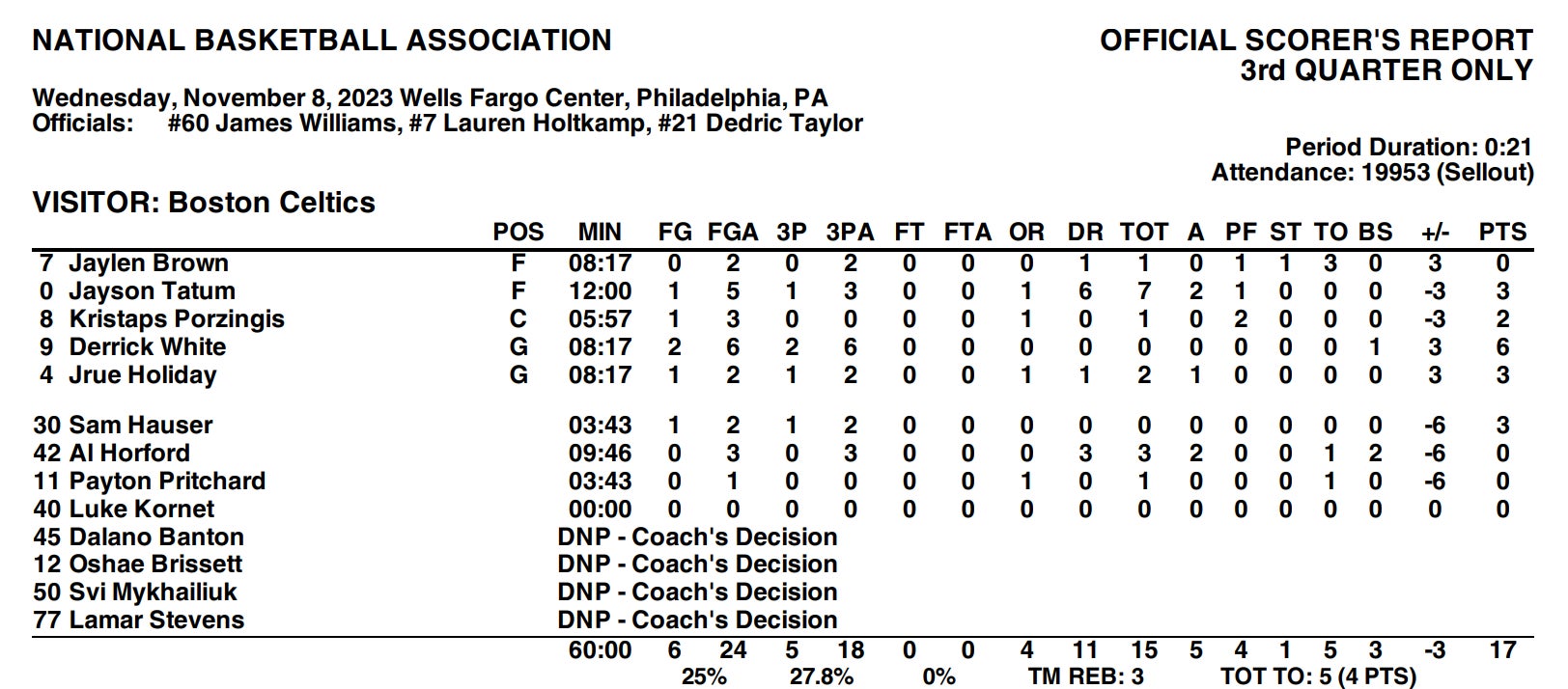 I think it's fair to say that for the second consecutive season, Derrick White is the best point guard on the roster. He was also the only one who showed any real sign of slowing down Tyrese Maxey (22 possessions / 2 points / 1-6 shooting), so for me Derrick mostly gets a pass. Would have loved some of those open 3s to drop, but overall Derrick played well.