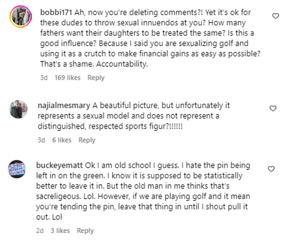 On Friday, the pro golfer-turned-influencer posted a photo on Instagram of herself wearing a skin-tight white collared shirt and skirt that reveals some of her backside.