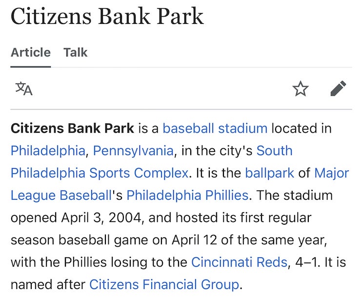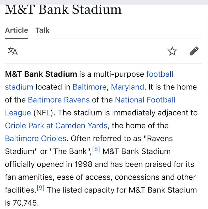 Another thing Jordie harped on was the fact that Banks called the Ravens Stadium "The Bank". I don't know if you know this, but the Ravens stadium is named "M&T Bank". The Phillies ballpark is called "Citizens Bank Park". Let's do a little history lesson, the Ravens stadium was opened in 1998 after they played a few games at old Memorial Stadium. It was PSINet until PSINet went bankrupt in 2002 and in 2003 it was renamed "M&T Bank", also known as "The Bank". The Phillies opened their ballpark in 2004. Hmm, weird. So Ravens fans have been calling their team's stadium "The Bank" since 2003, a year before the Phillies opened their ballpark and the Ravens and people of Baltimore are in the wrong? How does that work. You all were late to the party, don't try and gatekeeper a nickname you didn't have first. But let's check the almighty Wiki.