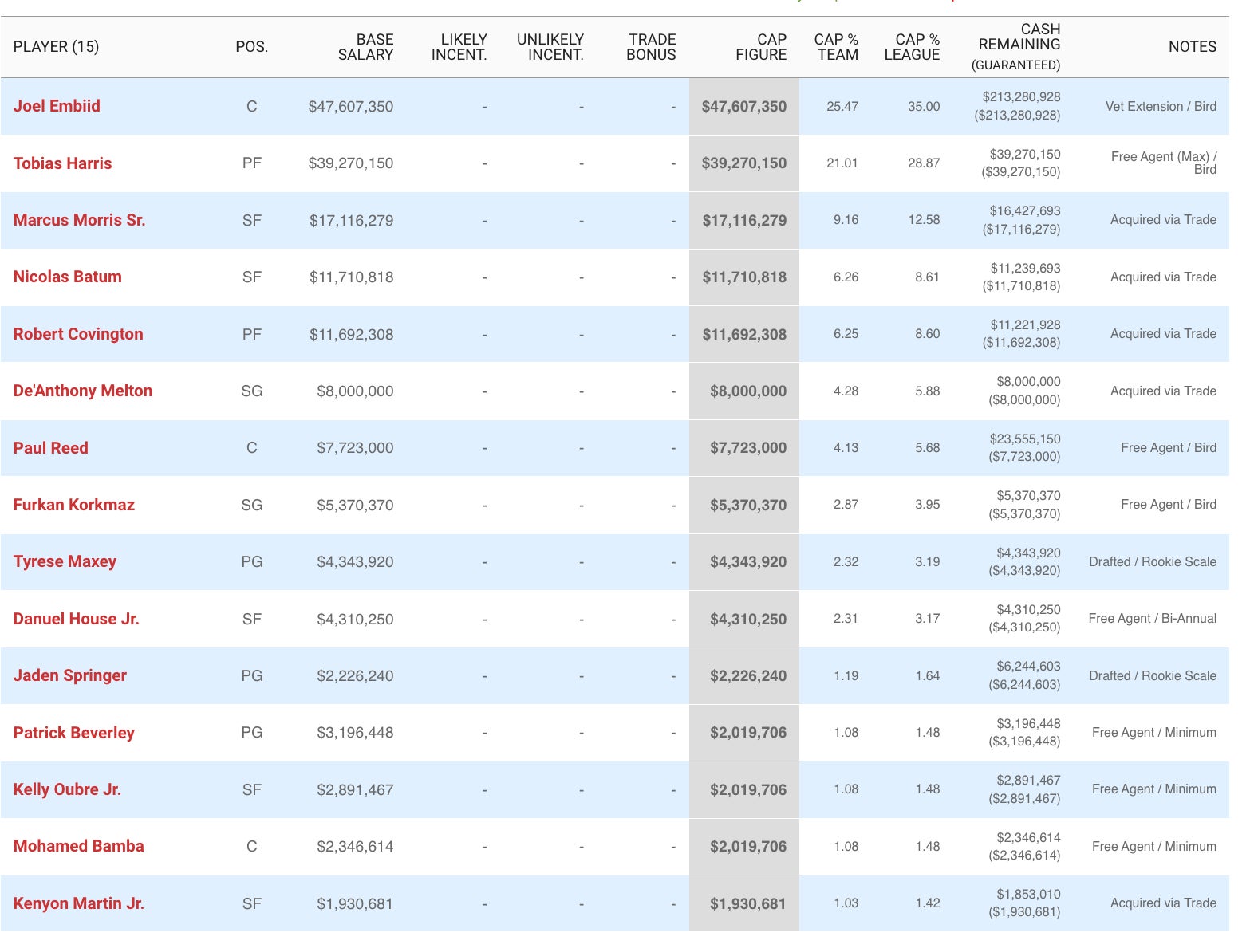 As you can see, there are a few mid sized salaries to play with here. Now, Morey could make this easy and see if the Bulls would be interested in taking on Tobias Harris' $39M deal, which might have some appeal to them seeing as how it's an expiring contract. To me, given how well Harris is playing in Nick Nurse's system, I would consider that unlikely. You made it this far with Harris, you may as well just ride it out.