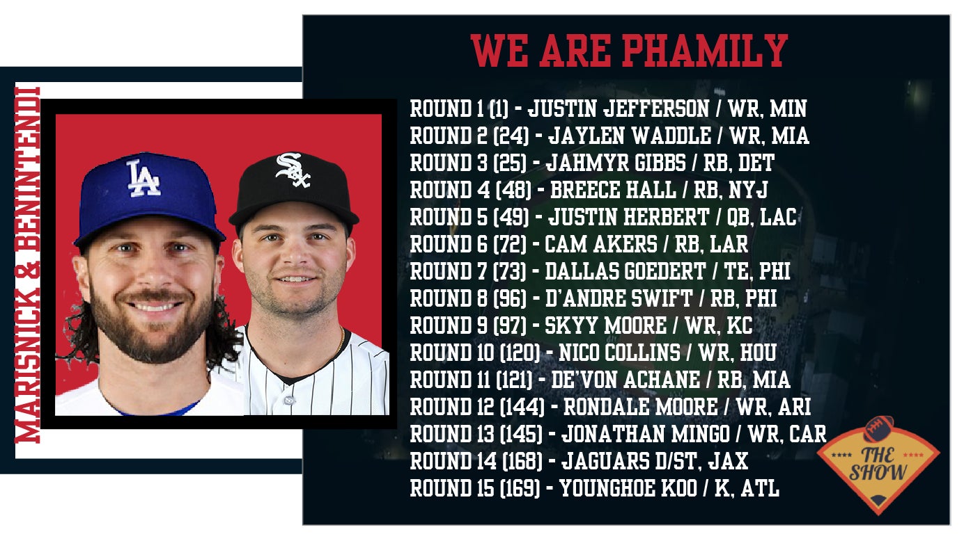 It was an awesome season of Fantasy Football in The Show Fantasy League. The team that had the #1 pick, Jake Marisnick, with new co-manager Andrew Benintendi took Justin Jefferson #1 overall and earned criticism for not going Christian McCaffrey in a PPR format. The rest of their draft was terrific. Waddle Round 2 was seen as good at the time, and they built outstanding depth throughout the draft. Jahmyr Gibbs really turned into an outstanding player, Breece Hall had some major peaks, Justin Herbert was great value in the 5th round with guys like Patrick Mahomes going in the 2nd round, D'Andre Swift in the 8th, Nico Collins in the 10th, De'Von Achane in the 11th, this is a good team top to bottom!