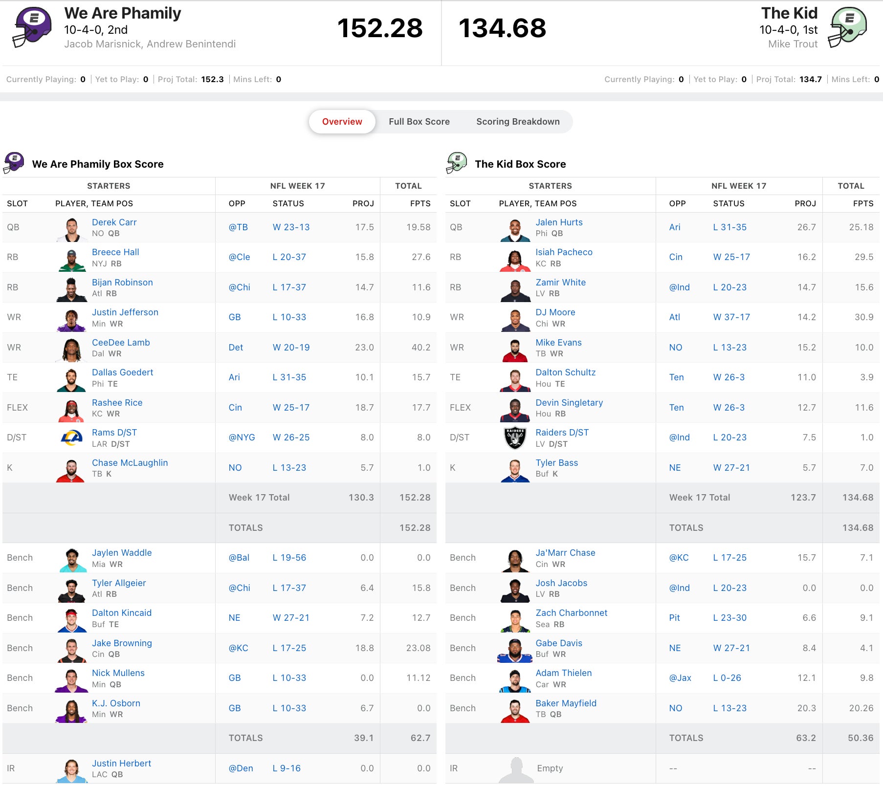 Trout, who finishes in 2nd place, put up a good fight with Isiah Pacheco giving him some very late hope, but it just wasn't enough as Rashee Rice and Justin Jefferson sealed the deal for Marisnick and Benintendi. That wraps up a fantastic season of fantasy football. Congrats to the historical champs which now include: