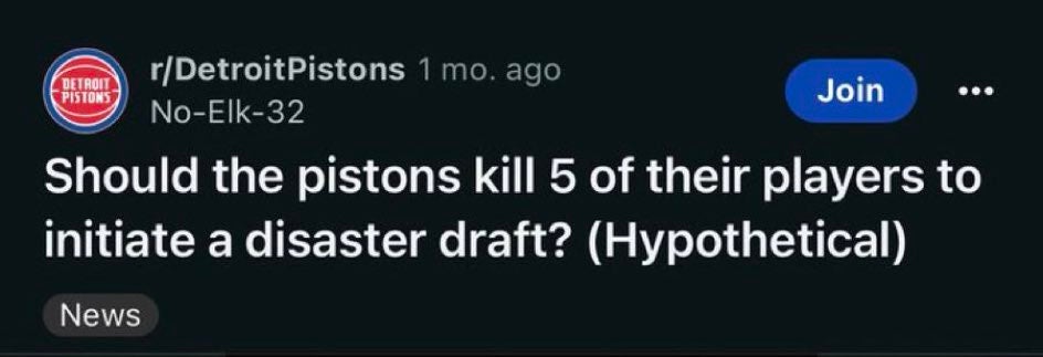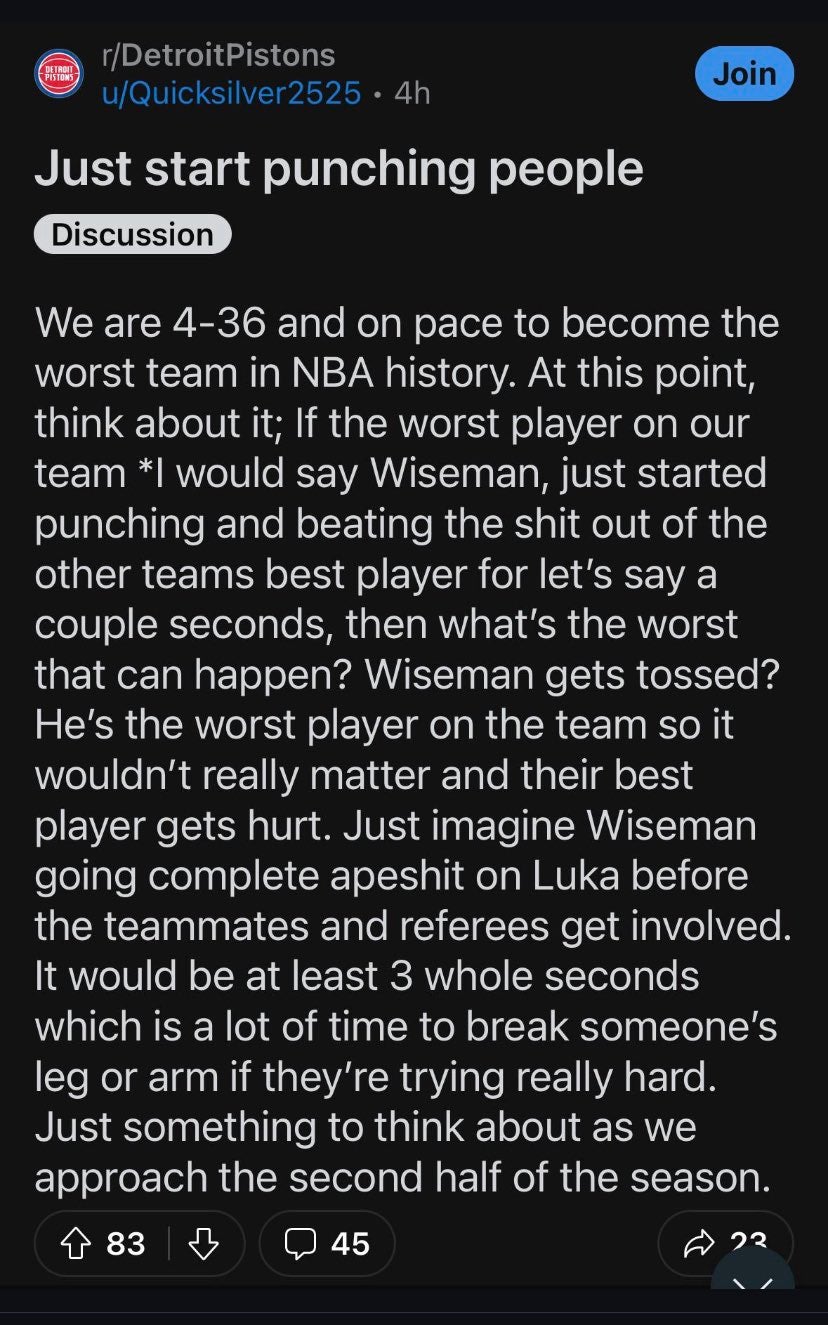 I will say, given the whole Malice At The Palace thing, maybe James Wiseman punching Luka Doncic isn't the greatest idea. One could argue the plan should be running an actual offense or trying to play a lick of defense, but at least this is a more realistic option for the team compared to what we've seen previously on the Pistons' Reddit