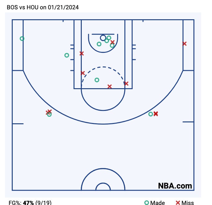 To me, this is a perfect shot chart for Derrick White. Last night was a game where he and KP were clearly the ones who had it going, and I think there's something to be said about everyone else sort of deferring to both guys instead of trying to force things. That tells you a level a trust and ego-less approach that this team will need to have if they want to win the title. The fact that White also snagged a career high 11 rebounds in addition to everything else, I'd go so far as to say this was one of Derrick's best all around performances of the year. Coming with Jrue out, that was huge.