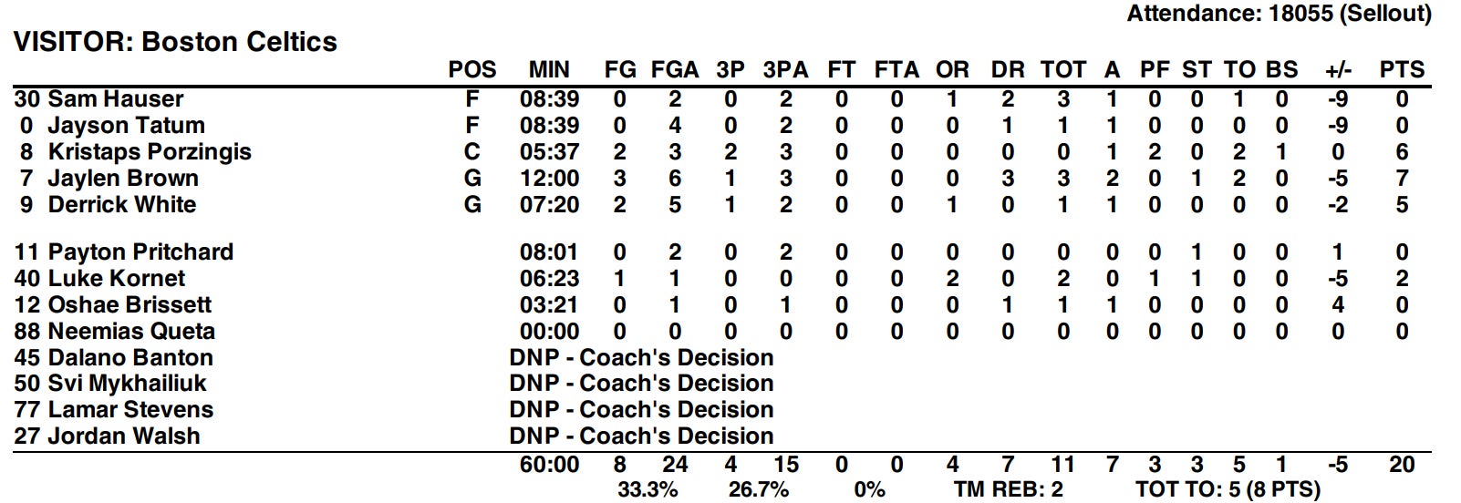 - The only starter with a negative +/- last night, this was certainly not the best we've ever seen Tatum play. In fact, it's one of those rare times we've seen him have back to back stinkers. Just 4-17 (1-6), 3 missed FTs, only 3 assists to 2 TOs, this wasn't even really a night where Tatum was making a big time impact in other areas. He was kind of sleep walking if we're being honest.