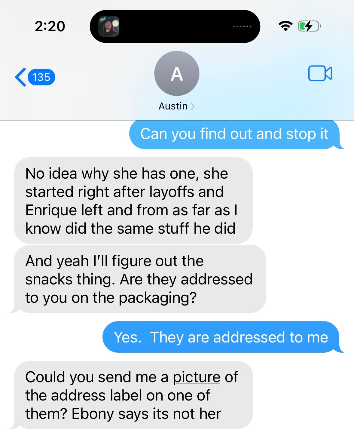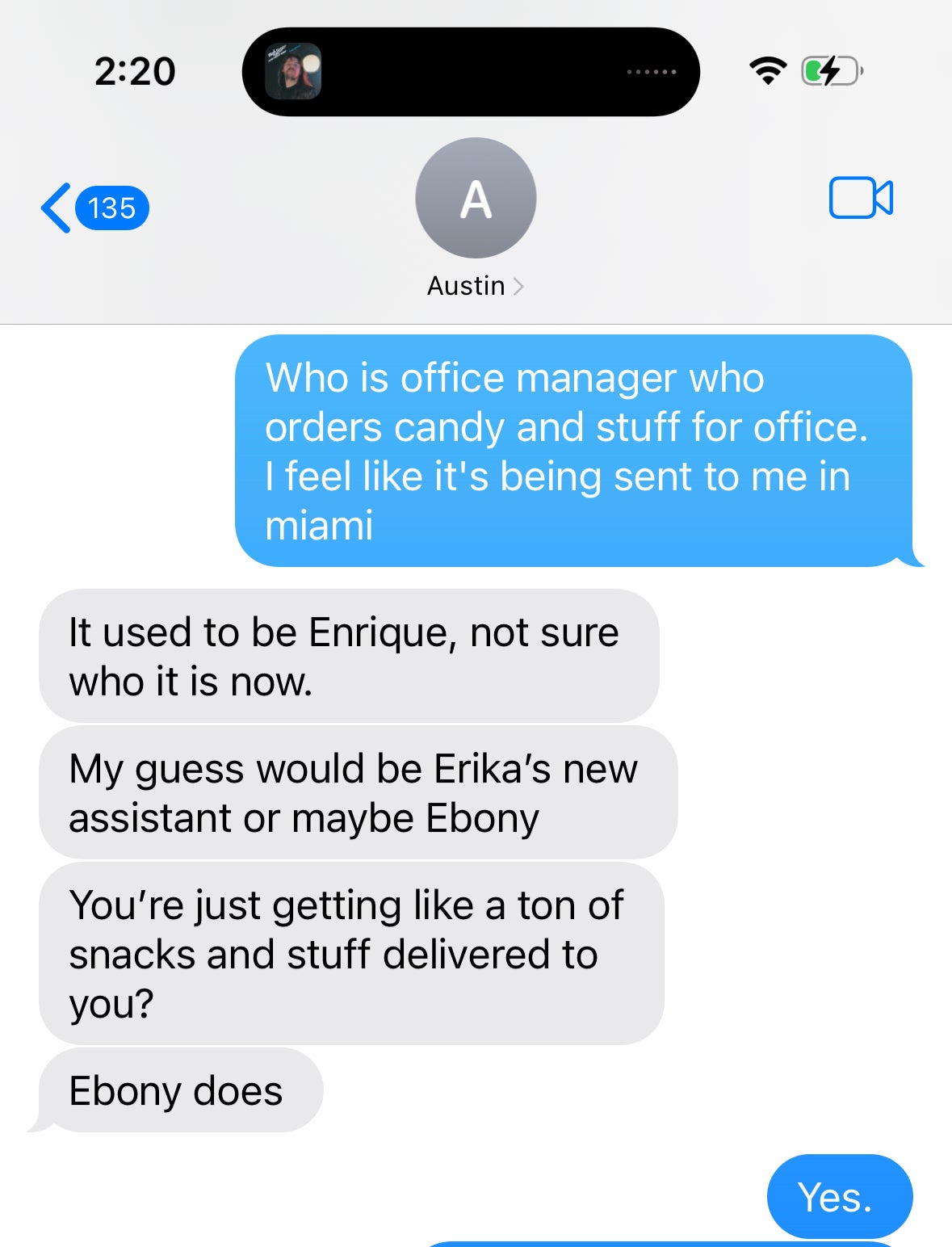 So yesterday I started receiving unidentified packages of snacks and junk food being sent to my Miami house. Little bags of cookies, candy, pretzels etc. It looked exactly like the snacks we have in the office. I assumed my address somehow got added to our office snack distribution list.