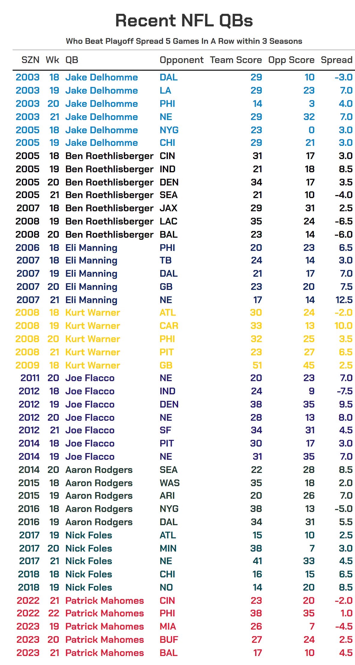 Did the Chiefs sort of manifest this doubt themselves by playing mediocre at best football for stretches during the regular season? Of course. But they went 2/2 in Patrick Mahomes' first ever road playoff games and 3/3 in beating the spread during the entirety of the playoffs. Mahomes is now just the seventh quarterback to beat the spread in five or more consecutive playoff games within a three-year span in the past couple decades: