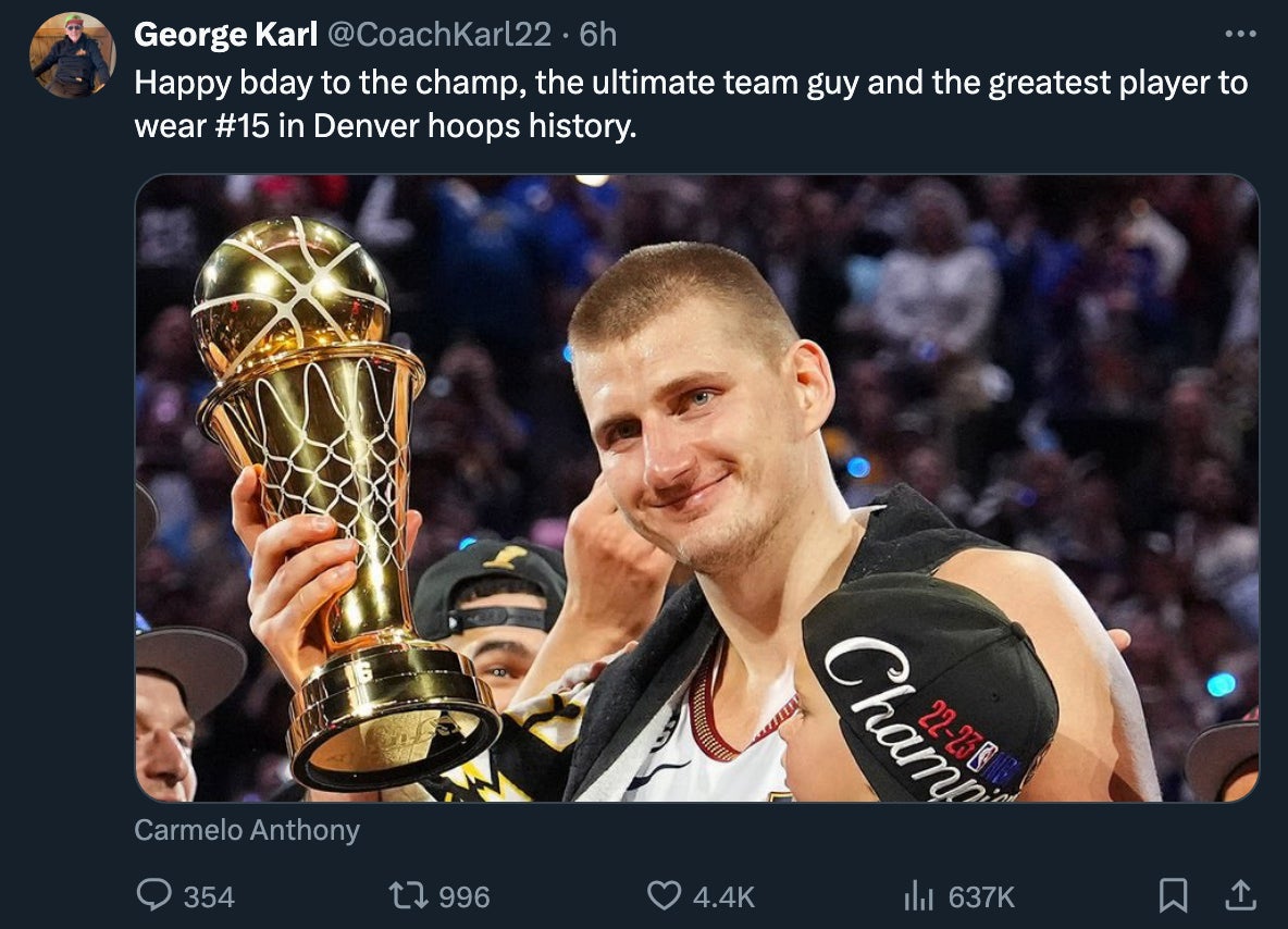 Karl isn't exactly wrong here, Jokic is most definitely the best player to ever wear #15 in Nuggets history. As you can imagine, Karl wasn't talking about the time that Anthony Randolph wore it for 2 seasons before Jokic got their in a post-Melo world. So even if he's telling the truth, it's still a dick move to take a random shot like that at Melo. You can praise Jokic without doing something like that, but that's the beauty of a beef like this. George Karl will never stop taking shots at Melo, even on posts that have nothing to do with Melo! If you can't respect that level of hating, I'm not sure what else could you want.