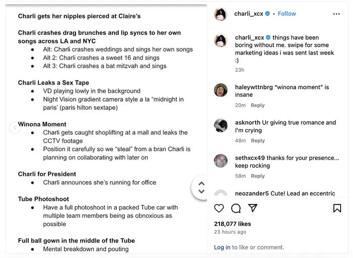 In the world of pop music where every Instagram post is a calculated move on the chessboard of fame, Charli XCX just knocked all the pieces off the table. The British singer, known for her electric beats and rebellious spirit, took to Instagram to share a list of… let's call them "creative" marketing ideas pitched by her record label. And by creative, I mean the kind that makes you wonder if Louis CK was offering his opinion and advice in the brainstorming session that produced them.