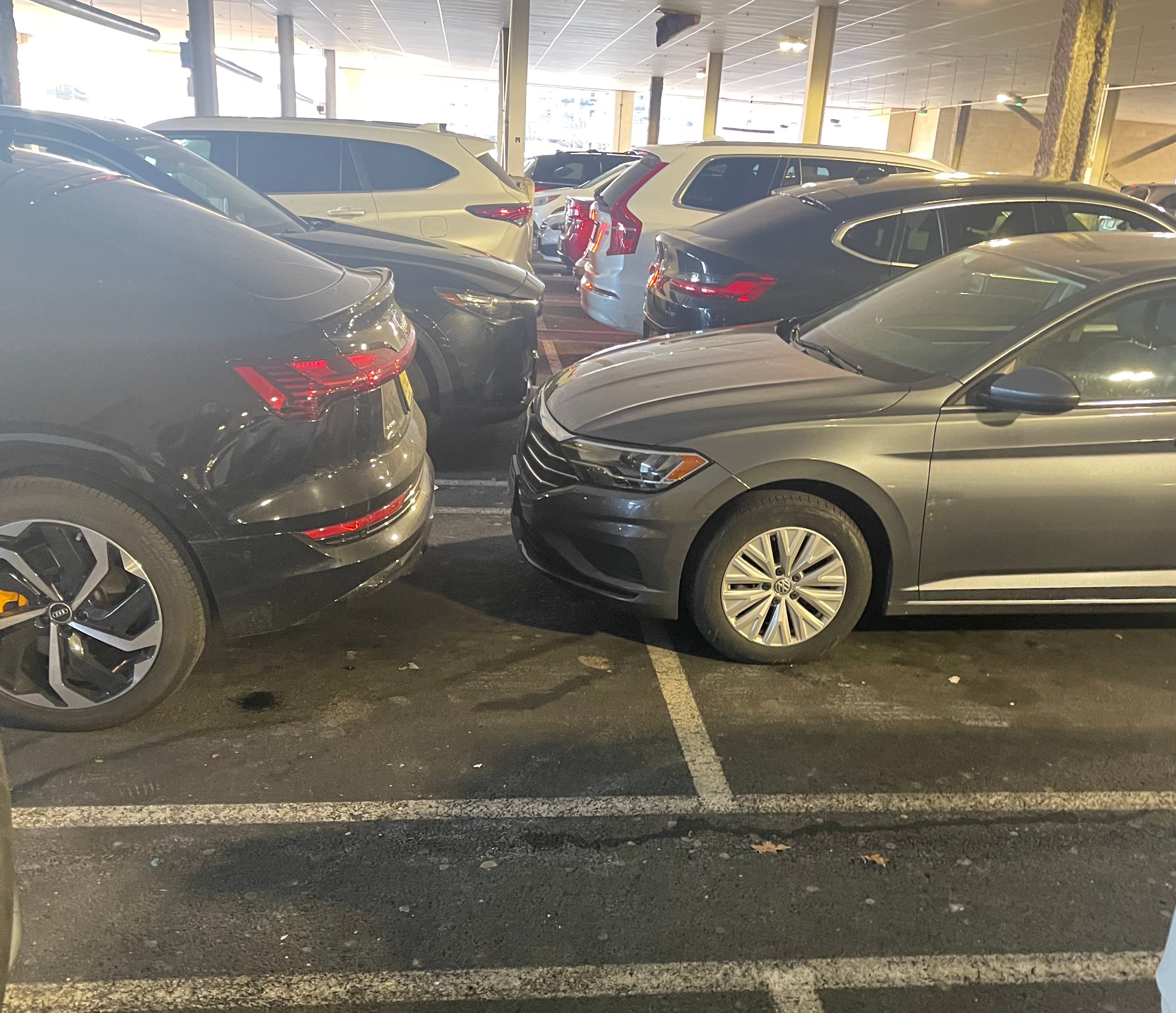 This little piece of shit Volkswagen is clearly 2 feet over the line at the front of his space, making it nearly impossible for anyone (me) with a full-sized SUV to park in front of him nose-to-nose.