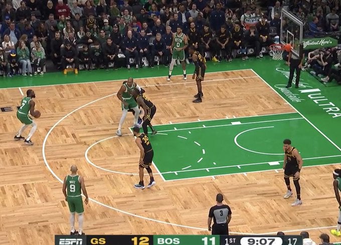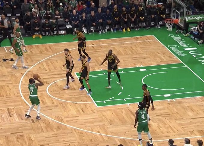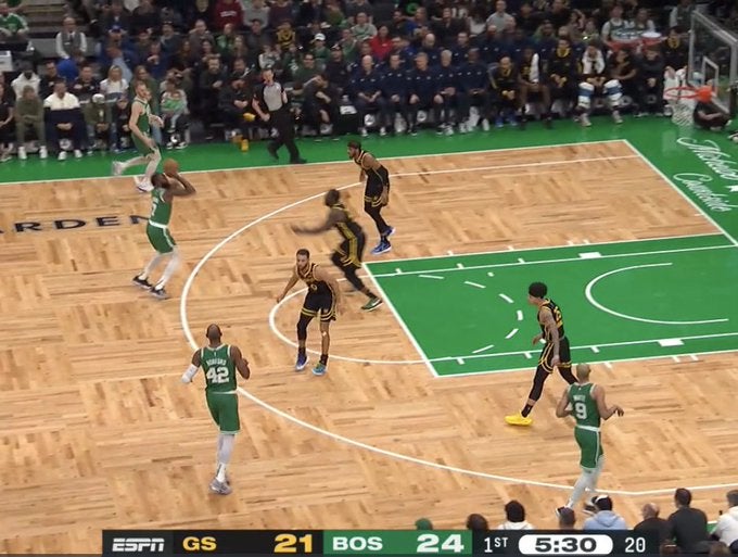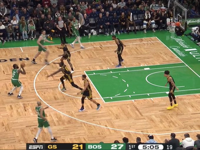 One of the most truly terrible defensive strategies you'll ever see deployed on an NBA court. The Warriors decided to guard Jaylen Brown, an All NBA player, as if he was Ben Simmons. Imagine thinking it's a good idea to give one of the best scorers in the league wide open look after wide open look?