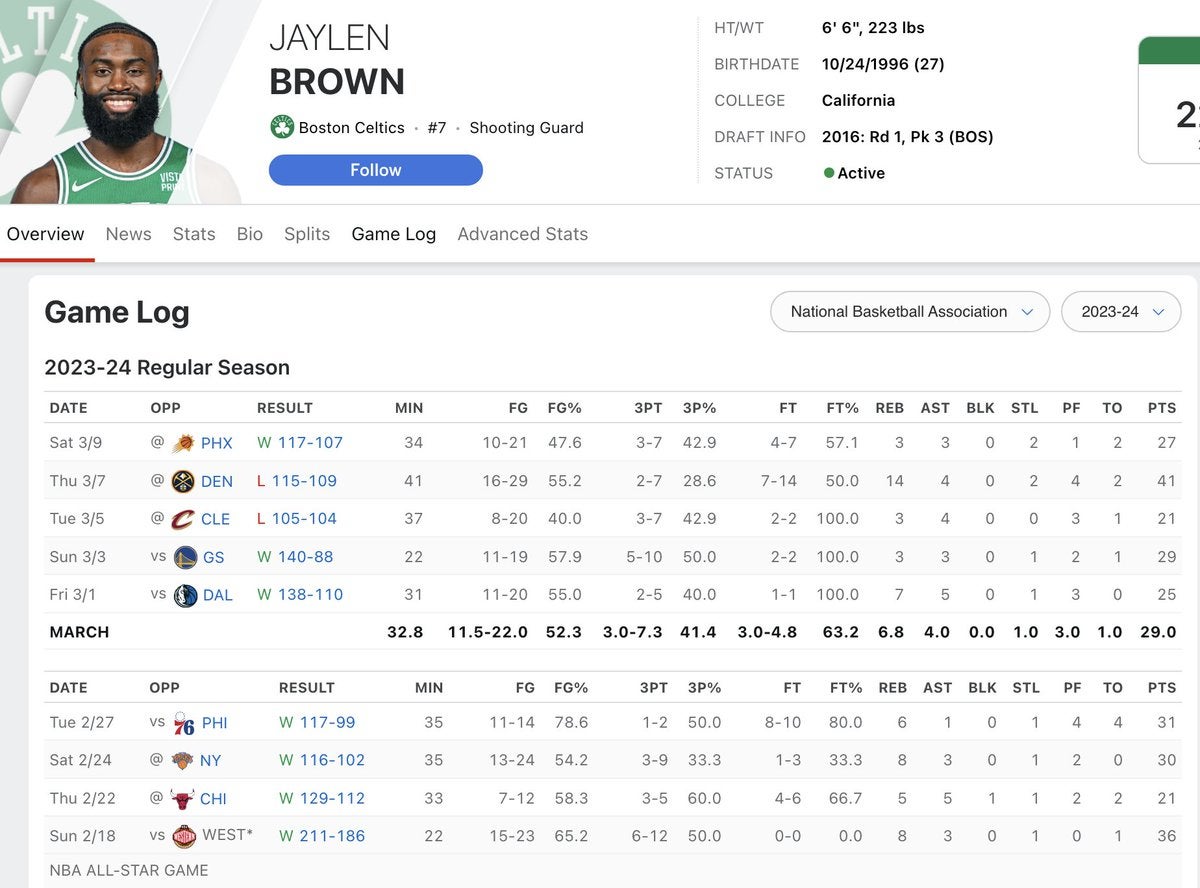 Since returning from the All Star Break, Jaylen Brown has done nothing but show incredible leadership. Not just for what he says after games or his mindset, but how he consistently has gone out and played some of the best basketball of his entire career. Every night, regardless of the opponent. On the road, at the Garden, it hasn't mattered