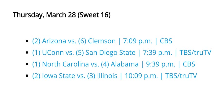 Can I say something honest? The one thing the bizarre 2021 NCAA Tournament had right was the 4 standalone games for the Sweet 16. I wish we still had that. I know people have 'real' jobs, but I'm selfish. I want to focus on each game by itself. Plus instead of two games starting at 9:45 or later, we'd only have one. What if we had tip times of 2:30, 5:30, 8:15 and 10? I wouldn't hate that. Move them up earlier if you really want to too. Either way, that was perfect.