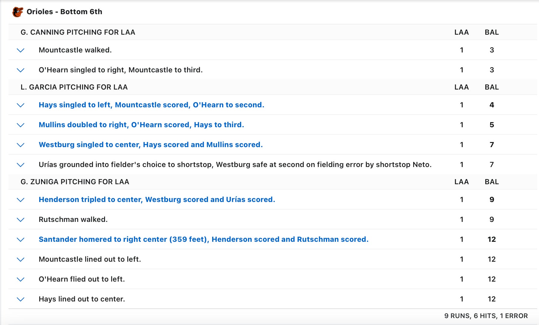 On Saturday in the 6th inning the Orioles scored 9 runs, it took the Angels 46 pitches to get their first out of the inning, it was a hitting clinic. Or a pitching disaster. I think it was both actually.