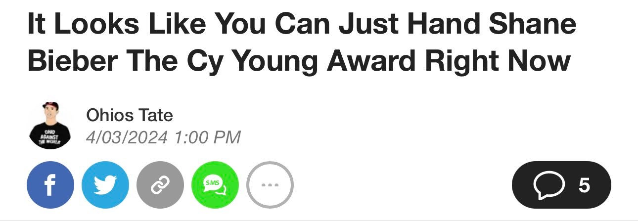 ….and the worst part is, the Guardians looked really, really good to start the season in their 6-2 start (with the White Sox coming to town on Monday). I hate to be like this, but it seems like we've been over-performing thus far, and now losing our Ace makes me feel like…..does this even matter? Odds were we probably weren't going to keep up this play the entire season, and those odds just took a huge hit with this news. Plus, odds were if we did dip off, we were going to trade Bieber by the deadline and at least get some prospects back. That's the other thing that simply blows about this news. He's on a 1-year deal and is an unrestricted free agent in 2025. We won't get his services as a pitcher or as trade bait. This is the worst news I could ever imagine coming across my desk on this now gloomy Saturday morning…..