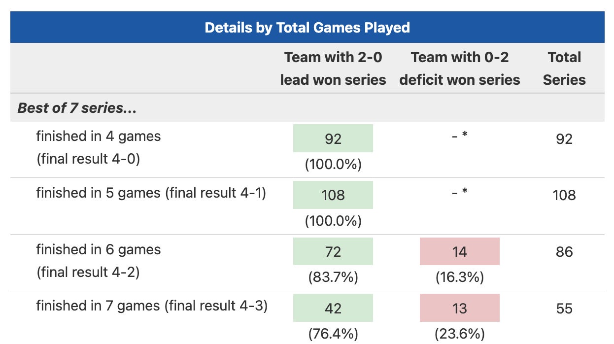 There's a saying that a playoff series doesn't truly start until someone loses at home, and while I understand that line of thinking, I do also think there's a level of copium associated with that line of thinking, especially if you're a fan of a road team that starts a series down 0-2. It's true that you have every opportunity to tie the series up as long as you take care of business on your home floor, but NBA history does not lie.