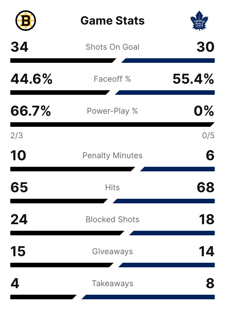 - The refs were a shit show on both sides tonight but the Bruins cannot keep putting the Leafs on the power play. I know we stoned them tonight (Leafs went 0-5) but just need to be as disciplined as possible going forward (easier said than done).