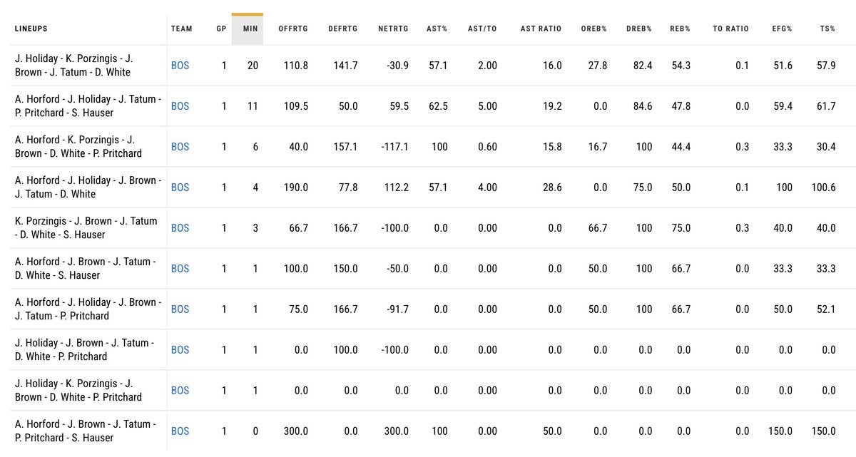 I can understand being mad at Joe for his rotations, but here's the thing. At some point, the players who are on the floor are actually going to have to produce. Look at these lineups! Starters? Horrendous. Double bigs with KP/Al? Gross. The only lineup that was even remotely successful was Tatum + the bench and Horford + starters, and it's not like you can play both those lineups heavy minutes.