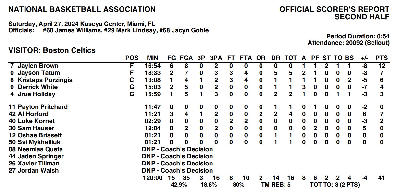 It was White's 12 points on 5-7 (2-3) in the second quarter that really helped the Celts get their separation. Tatum had already started to get things going that quarter (13 points), but it was White's close over his 6:58 of time on the floor that was the knockout punch.
