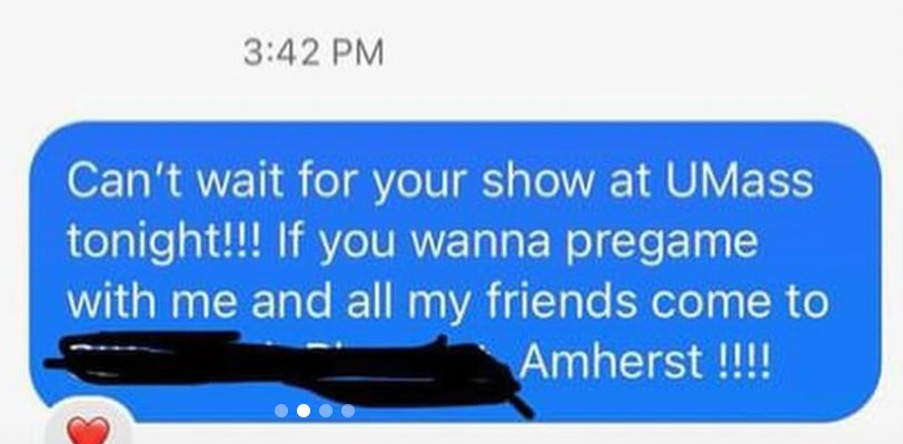 Which is probably why he did. She wasn't thirsty, she simply invited him to a social gathering of like minded ladies and he took her up on it. Snapped a few pics with the boys and went on his way. The concert looked like it ripped too. Apparently Steve Aoki was also at UMass pie-ing people to death?…