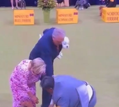 Carrying that good boy like I do one of my kids when it's time to put them in their room. Then the run by the guy in the black suit coming out. Never break character! Always be practicing at the Westminster Dog Show. Don't love the competitor spirit here though if we're being honest. I'm very anti-fake sportsmanship. Don't help up an opponent, let their own teammates help them out. If you're in a solo competition your dog or yourself need to pick you up. Tough look no matter how you want to describe it though. Can't be bellyflopping at the Westminster Dog Show.